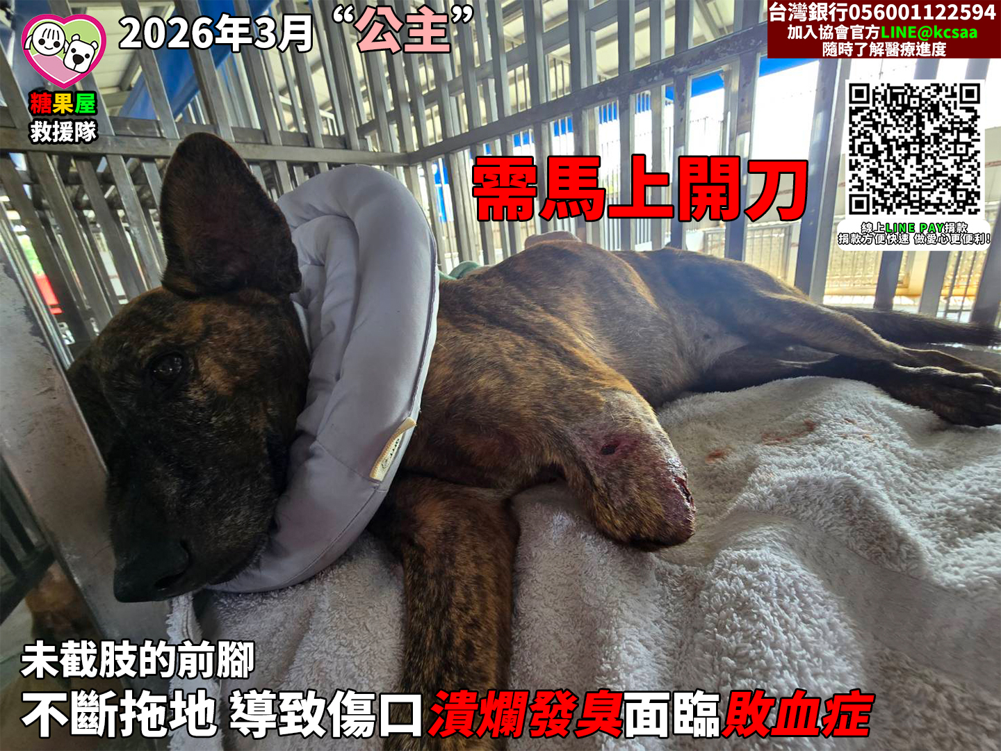 😭經過長時間跑步前肢重心不穩,造成摩擦地面潰爛照顧人員發現時,牠已經不吃不喝也站不起來。