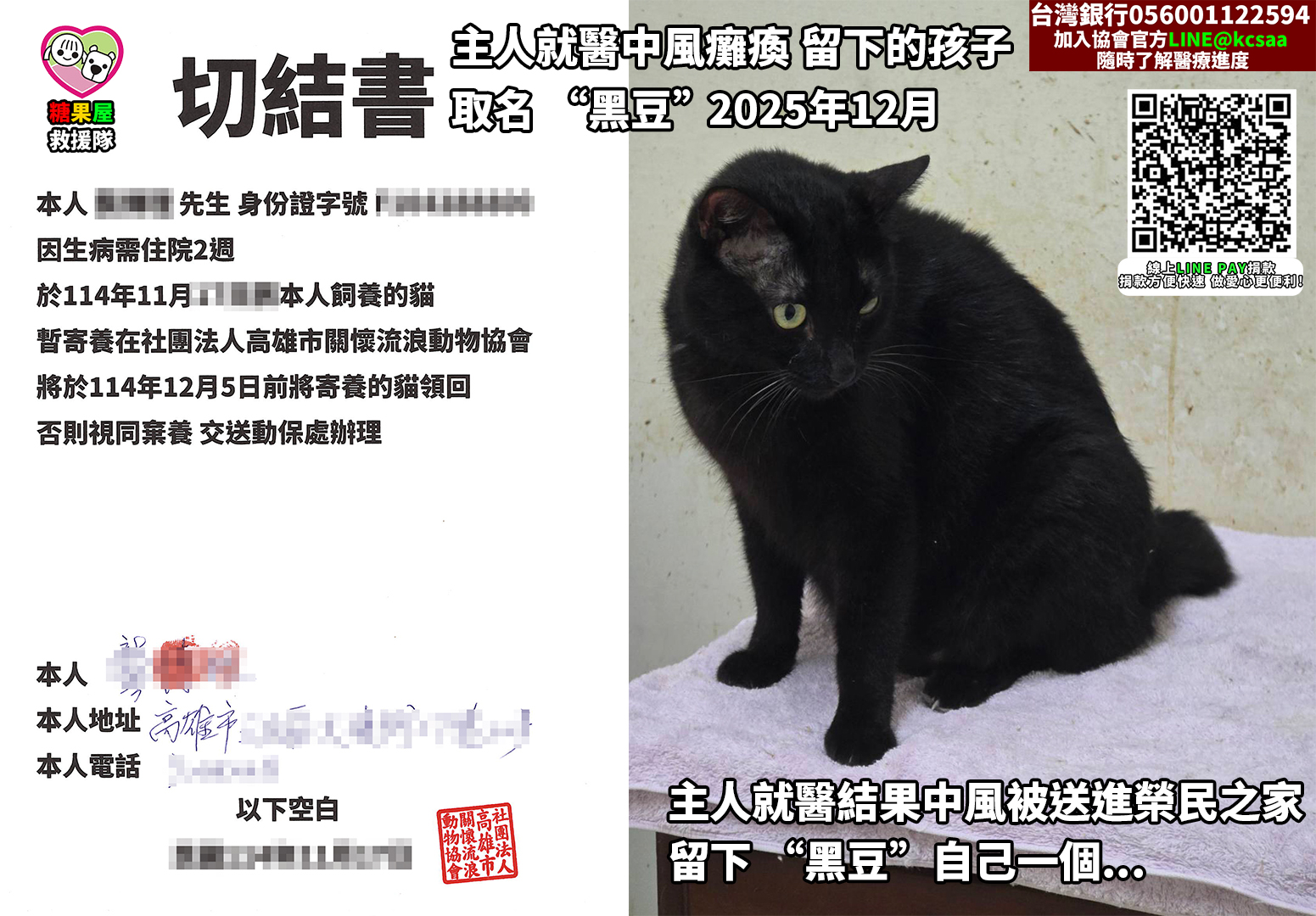 📛高雄市動物保護處說他們可以來接‘’黑豆‘’去收容所我們於心不忍。