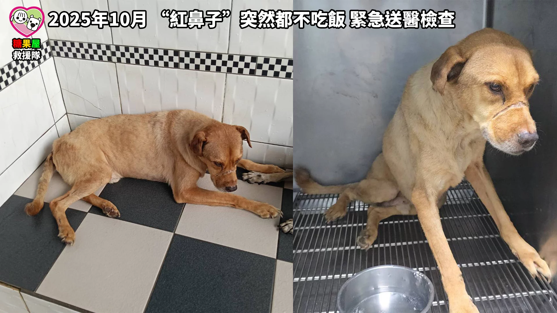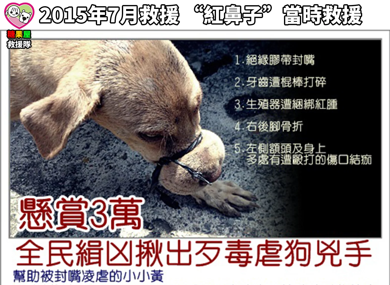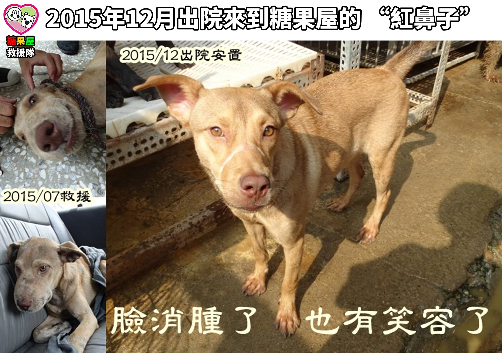 救援紀錄 10年”紅鼻子”下台一鞠躬 2015年10月 是我們救援”紅鼻子”的日子 當時嘴巴被有心人士用膠帶封住 無法吃飯 無法喝水 就是要牠死路一條… 救援送醫治療到出院住進糖果屋 “紅鼻子”這一住就是10年 10年過去 “紅鼻子” 年紀大了 看著這孩子從年輕小伙變成步伐緩慢的阿伯 今天發現”紅鼻子”平常加餐的罐頭都不吃 食量也明顯變小 緊急送醫才發現 “紅鼻子”感染嚴重的愛麗希體 醫療團隊搶救仍無法挽回”紅鼻子”的生命 “紅鼻子” 乖 已經不會痛了 去當個自由自在的小天使吧 “紅鼻子”當時救援 2015年7月30日【懸賞3萬‧全民緝凶揪出歹毒虐狗兇手】 今天辦公室有上班”土雞”值班!